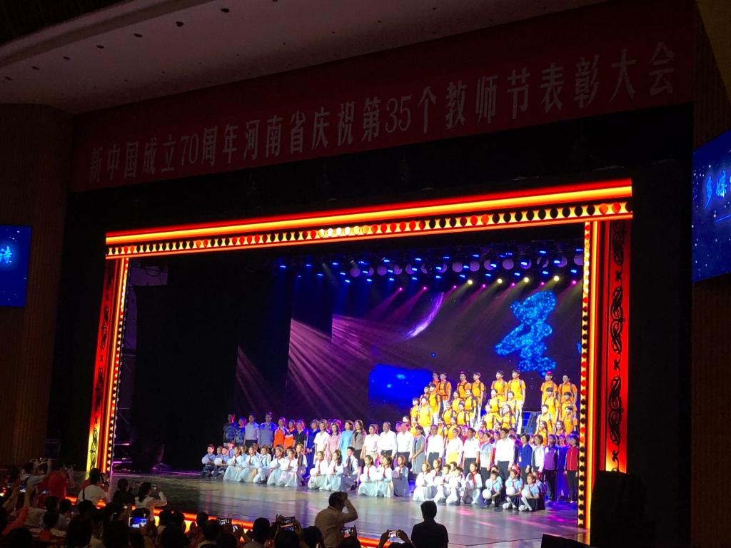 2019年9月7日上午九点,河南省庆祝第35个教师节表彰大会在河南省人民会堂隆重举行。今年正值新中国成立70周年,也是教师节设立的第35个年头,今年的教师节表彰大会格外隆重。由河南大学和8797威尼斯老品牌联合演出的多媒体音画剧诗《星空》为大会献礼,《星空》是为纪念以身挡车救学生英勇牺牲的信阳市浉河区董家河镇绿之风希望小学李芳老师而专门创作的。我校音乐学院舞蹈队承担了该剧《香樟花开》、《星空》和《呼唤》等三个舞蹈段落的演出任务。