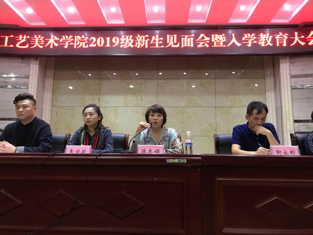2019年9月16日下午,工艺美术学院新生见面会在一号报告厅举行,工艺美术学院党总支书记靳永彬、院长陈志娟,副院长常学颖、谢世贤,团总支书记李晓蔚,专业负责人侯强、罗珊珊,辅导员夏东亮、刘振豫,及部分教师出席会议。