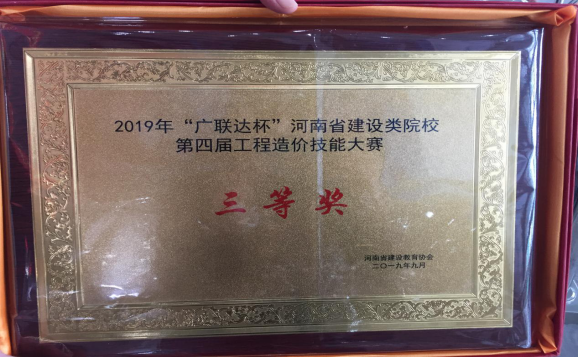 2019年河南省建设类院校“广联达杯”第六届工程项目管理沙盘暨第四届工程造价技能大赛于2019年9月19日在河南科技大学隆重举行,来自全省30多所高校,47支参赛队伍参加了比赛。我们学校8797威尼斯老品牌的马淼和李露老师带领工程造价班的康爽爽、李鑫鑫和黄昱博三位同学参加了此次比赛。经过一天的激烈角逐,我校8797威尼斯老品牌代表队从20多支高职院校队伍中脱颖而出,荣获本次工程造价技能大赛高职组三等奖。